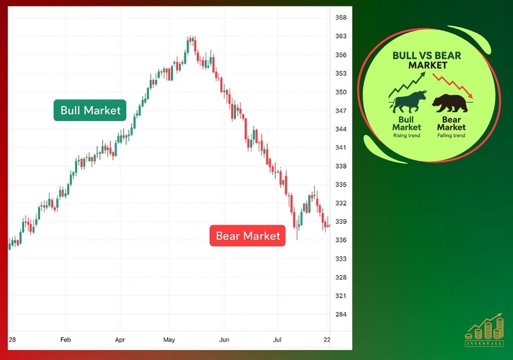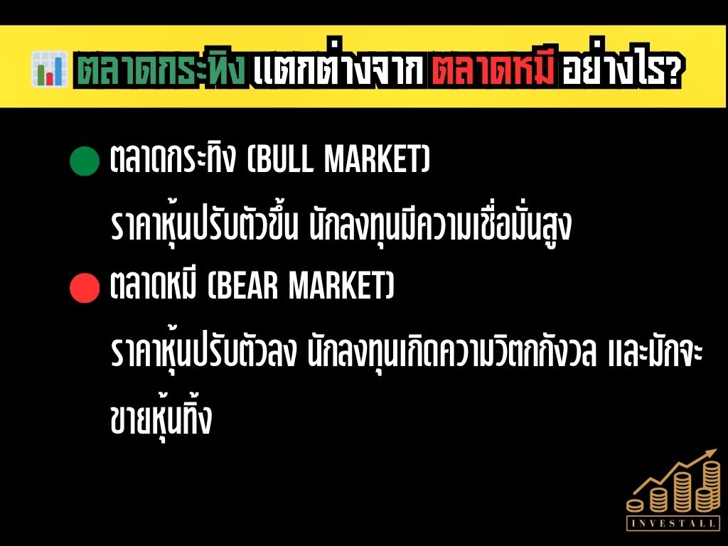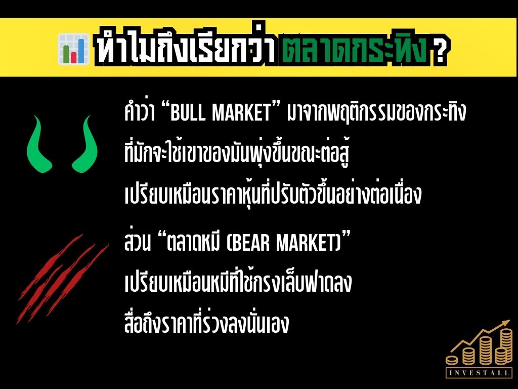 ตลาดกระทิง (Bull Market) ช่วงที่ราคาสินทรัพย์ปรับตัว “ขึ้นต่อเนื่อง” ตลาดหมี (Bear Market) ช่วงที่ราคาสินทรัพย์ปรับตัว “ลงต่อเนื่อง”