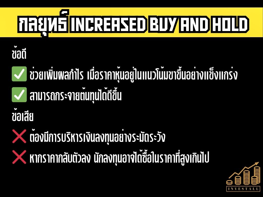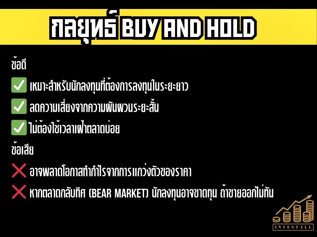 ข้อดี เหมาะสำหรับนักลงทุนที่ต้องการลงทุนระยะยาว ลดความเสี่ยงจากความผันผวนระยะสั้น ข้อเสีย คือ คุณอาจพลาดโอกาสทำกำไรจากการแกว่งตัวของราคา และถ้าหากตลาดกลับทิศ (Bear Market) อาจขาดทุนถ้าขายไม่ทัน