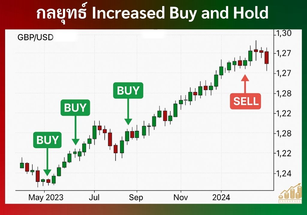 สูตรนี้เป็นการพัฒนาเพิ่มเติมต่อยอดมาจาก Buy and Hold โดยนักลงทุนจะ ทำการซื้อเพิ่มขึ้นเรื่อย ๆ เมื่อราคาหุ้นปรับตัวสูงขึ้น สำหรับวิธีที่นิยมคือ ซื้อเพิ่มในทุกช่วงที่ราคาปรับตัวขึ้นตามระดับที่กำหนด